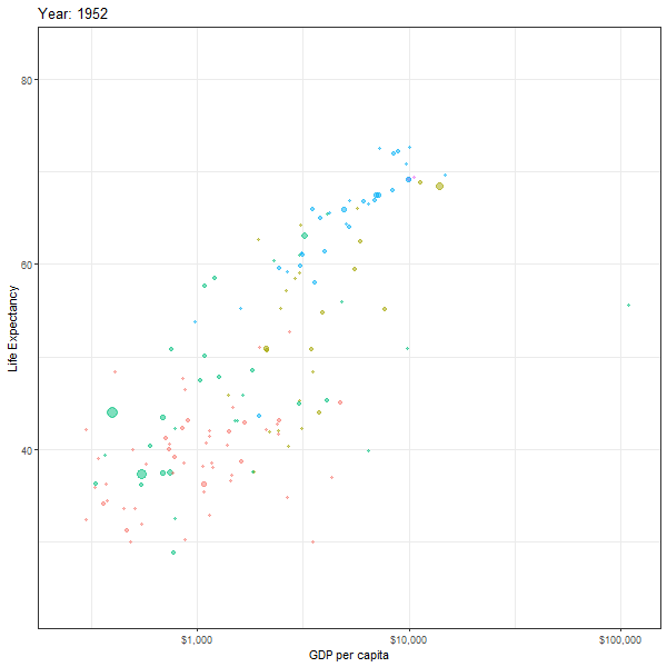 If we want to animate the evolution of the relationship between life expectancy and GDP, similar to Hans Rosling’s 200 Countries, 200 Years, 4 Minutes, we can use the code below
