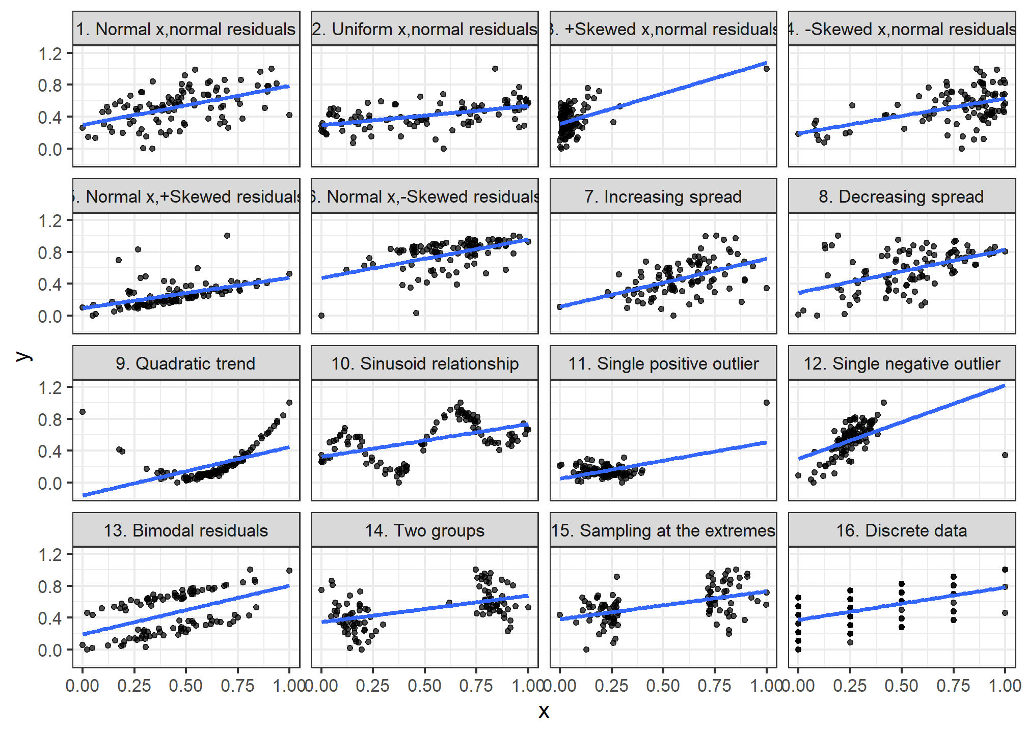 We will visualise 16 different datasets, all of which have a correlation of 0.50, and a sample of size n = 100.