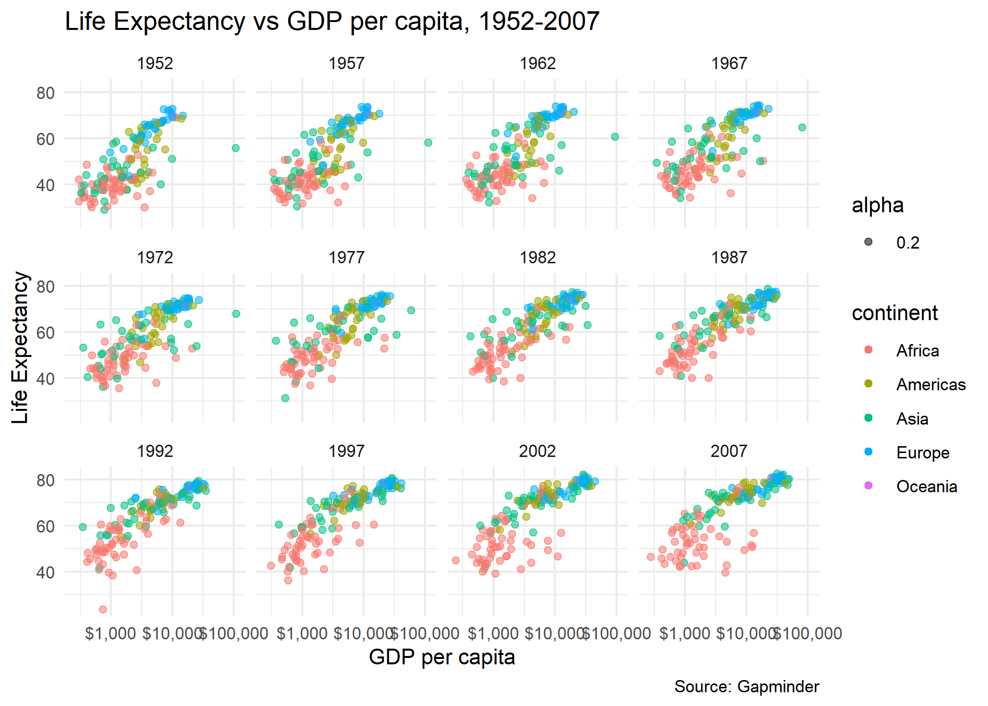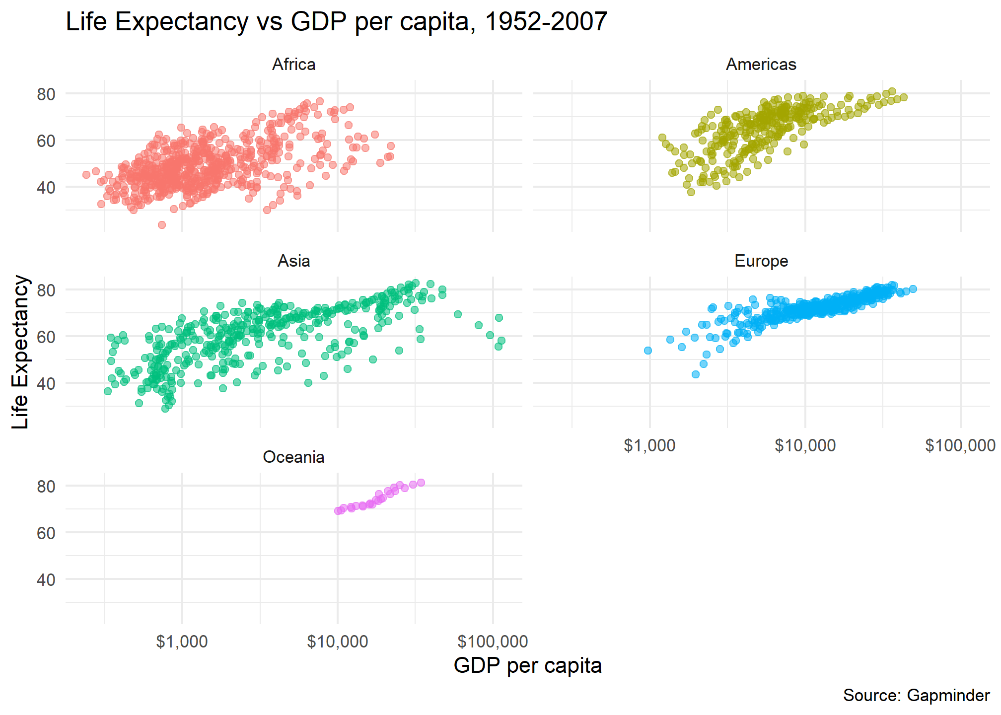 Finally, instead of one scatter plot, if we wanted to facet our animation by continent, we just add the facet_wrap(~continent) line of code as shown below