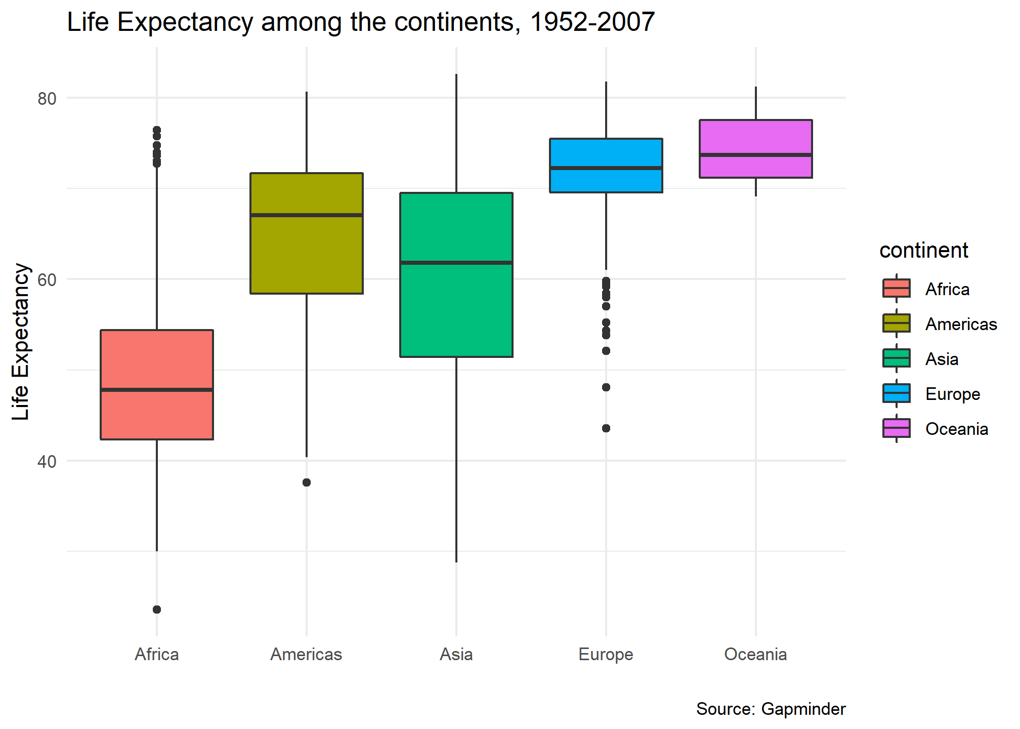 Finally, if instead of a scatter plot we wanted to create a boxplot of life expectancy by continent, we use similar aesthetics, but the relevant geometry is geom_boxplot().