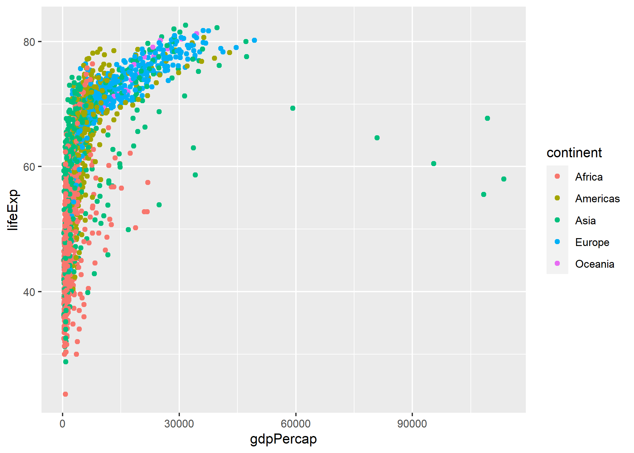 What if we wanted to colour the points by the continent each country is in? This is a change of the aesthetic properties, so we just add colour = continent.