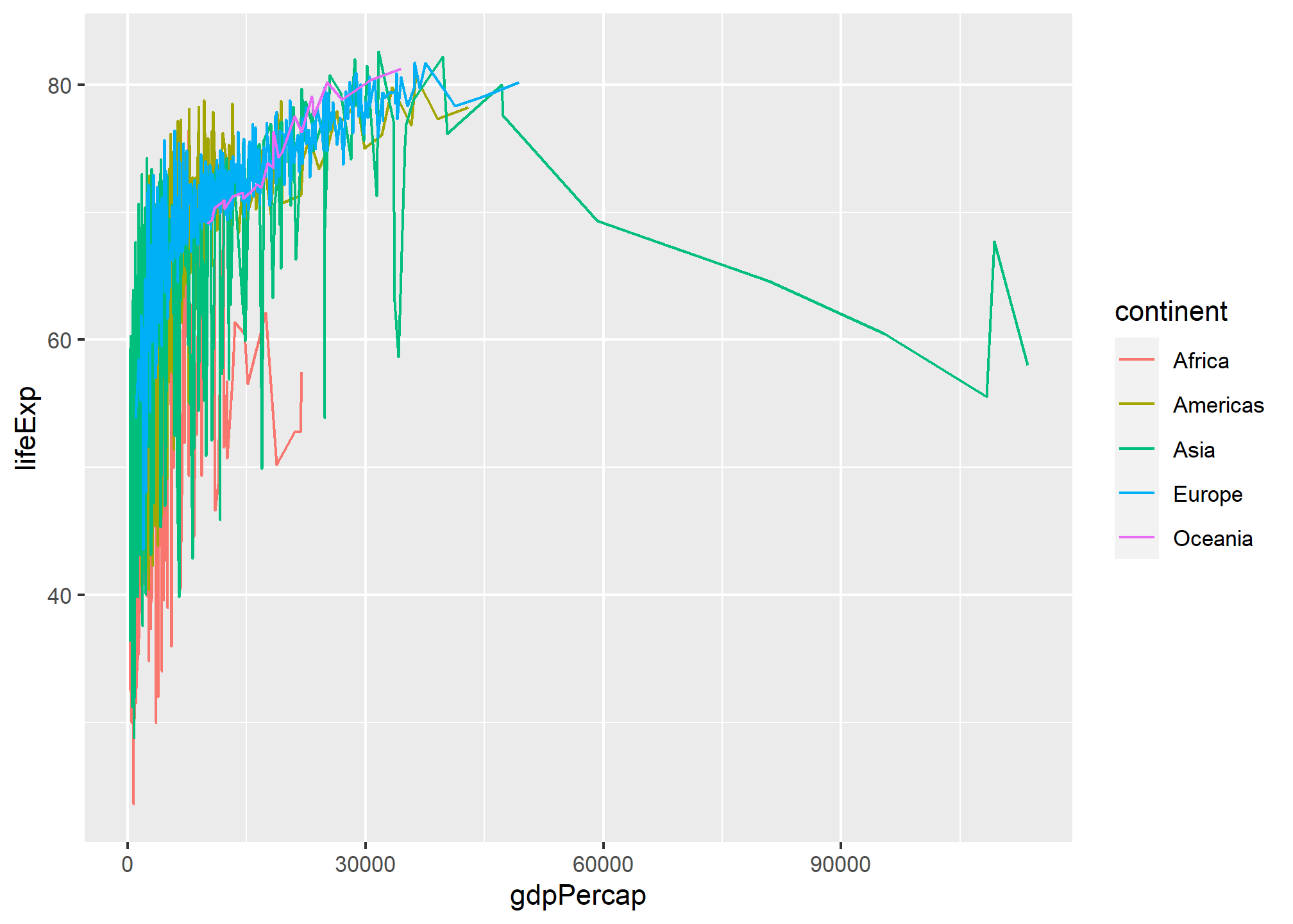 What if instead of a scatter plot we wanted to create a line plot? It would be the same code as before, but now the relevant geometry we should is geom_line insrtead of geom_point.