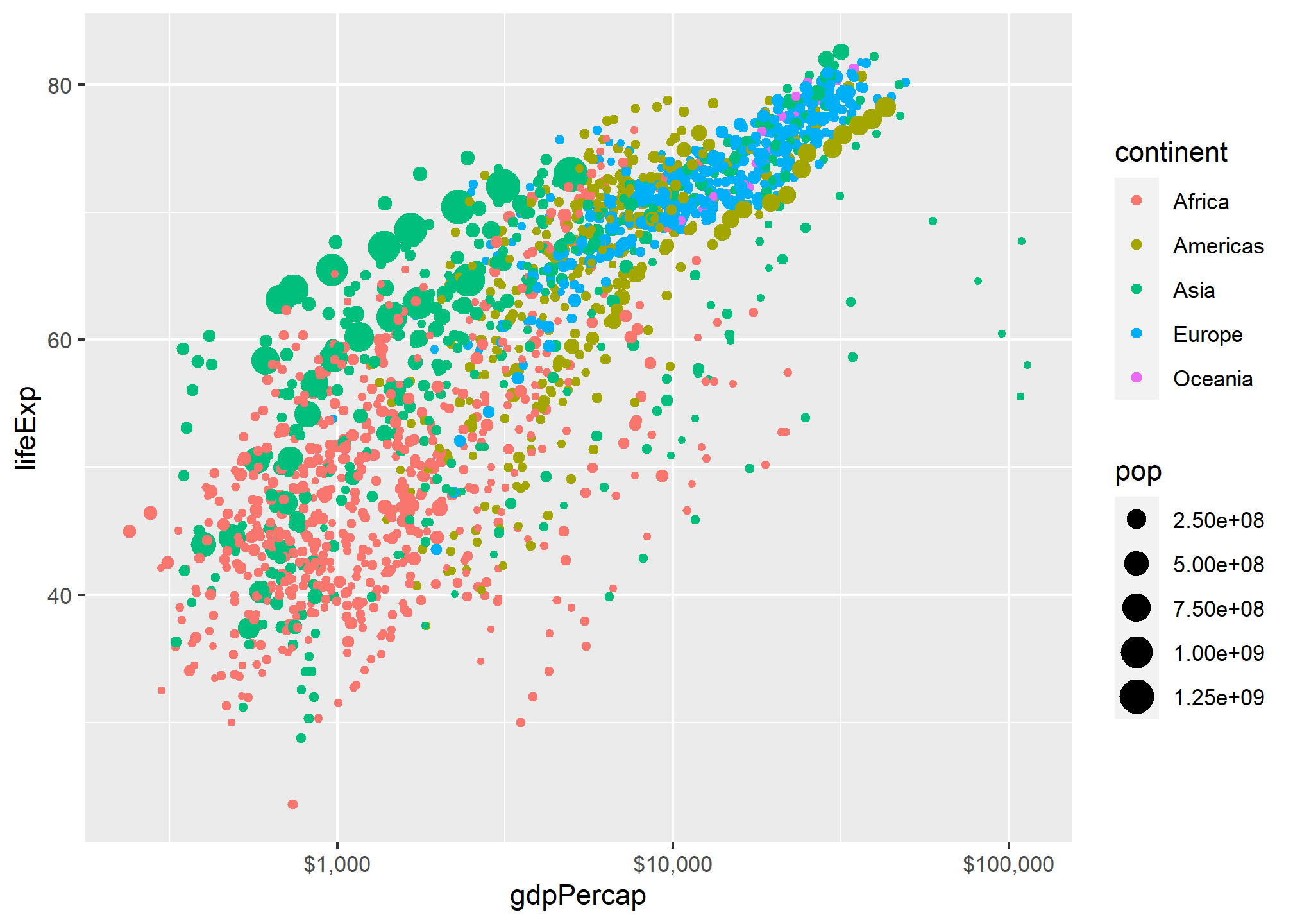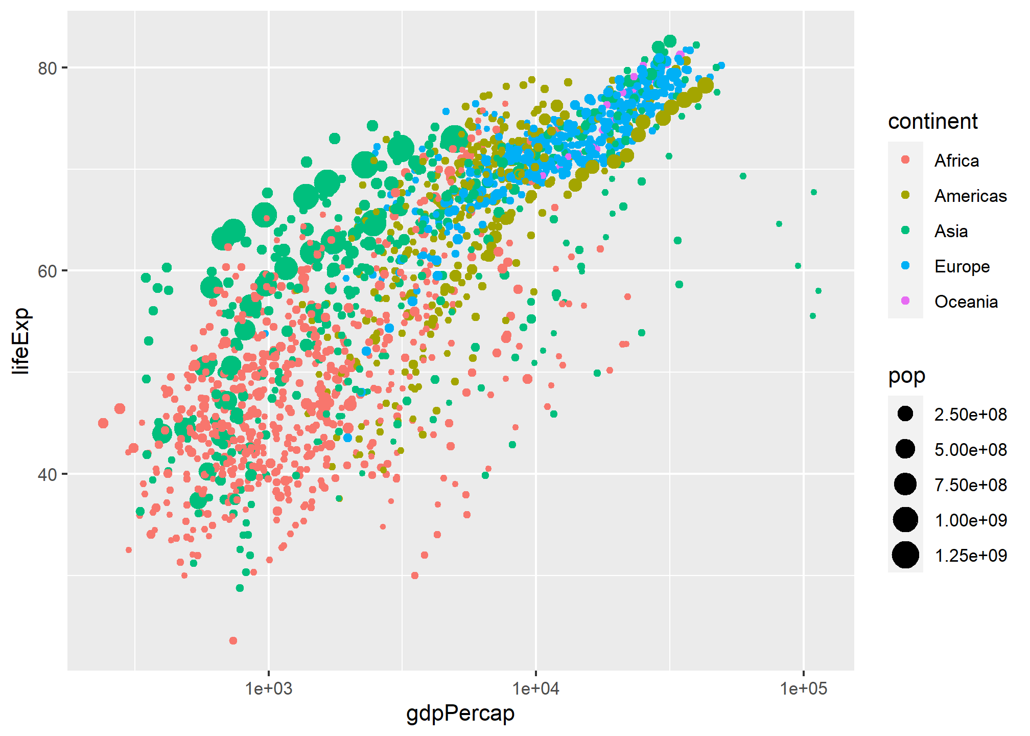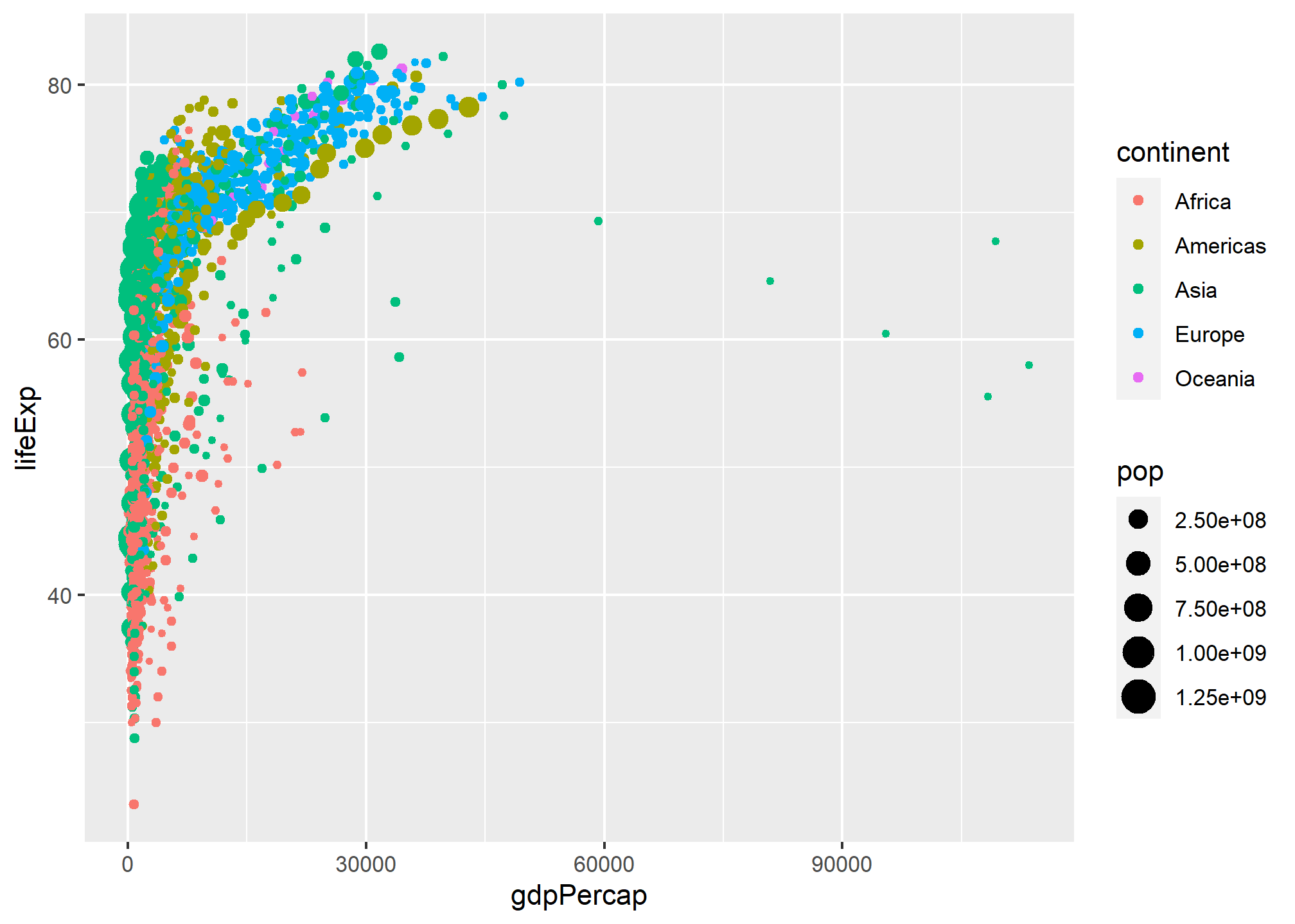What if we wanted to have the size of each point correspond to the population of the country? This is not a geometry, but an aesthetic property. If we add size = pop, the points produced will be proportional to the country’s population, and we still have the aesthetic property colour = continent that will colour its point with the continent the country is in.