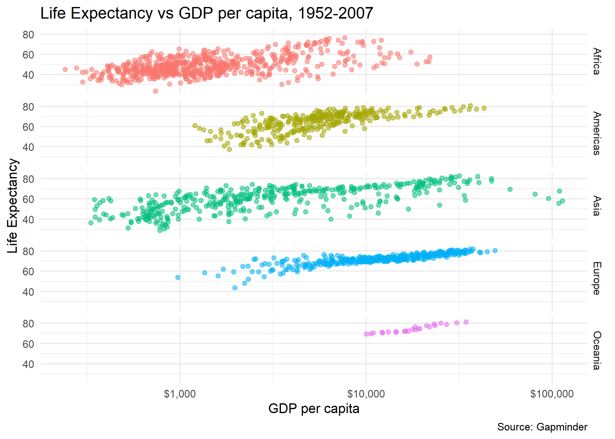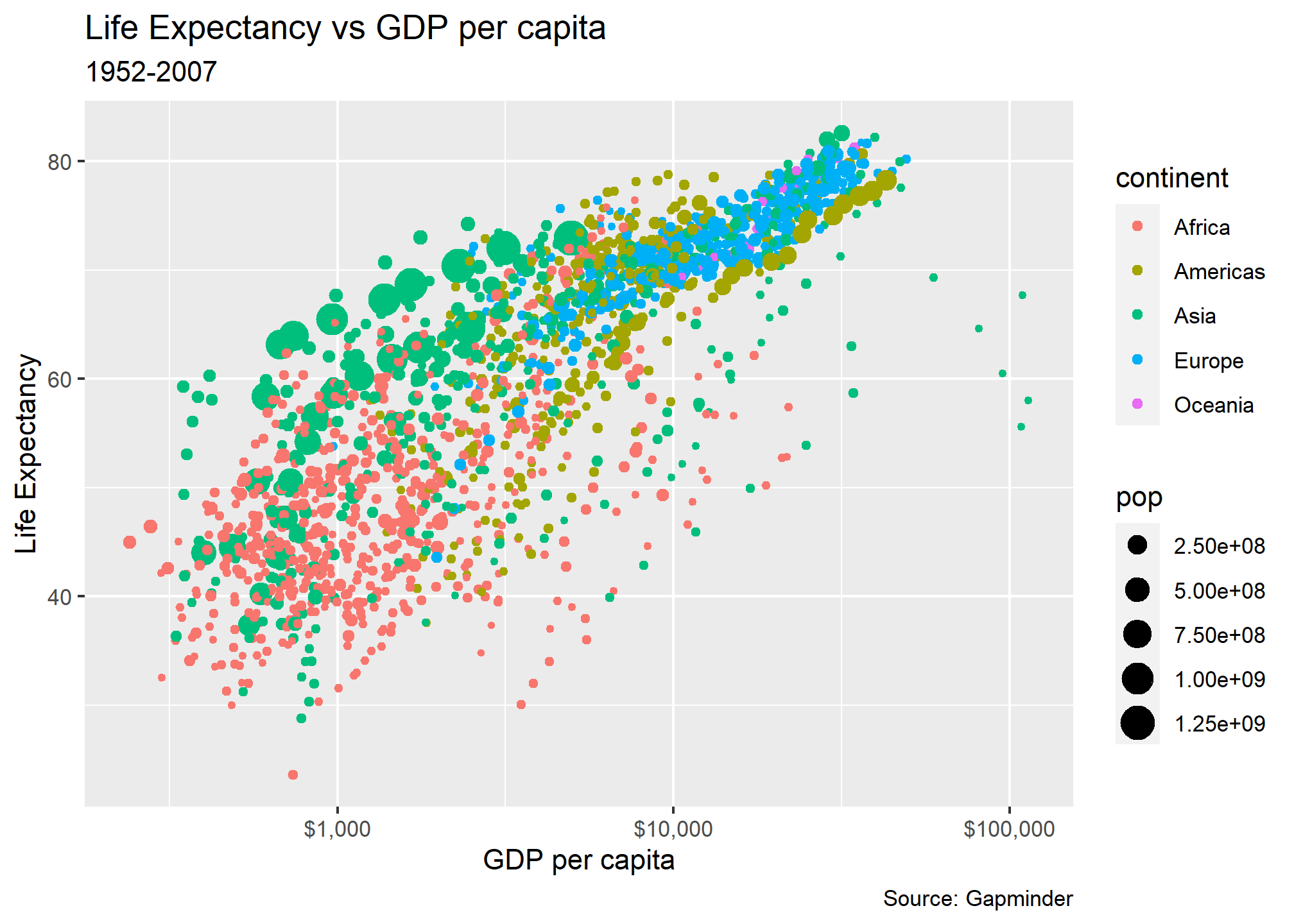 In the following examples, we will use the gapminder dataset with data on life expectancy lifeExp, population pop, and GDP per capita gdpPerCap for a number of countries between 1952 and 2007. We want to build a graph that shows the relationship between GDP per capita and life expectancy.