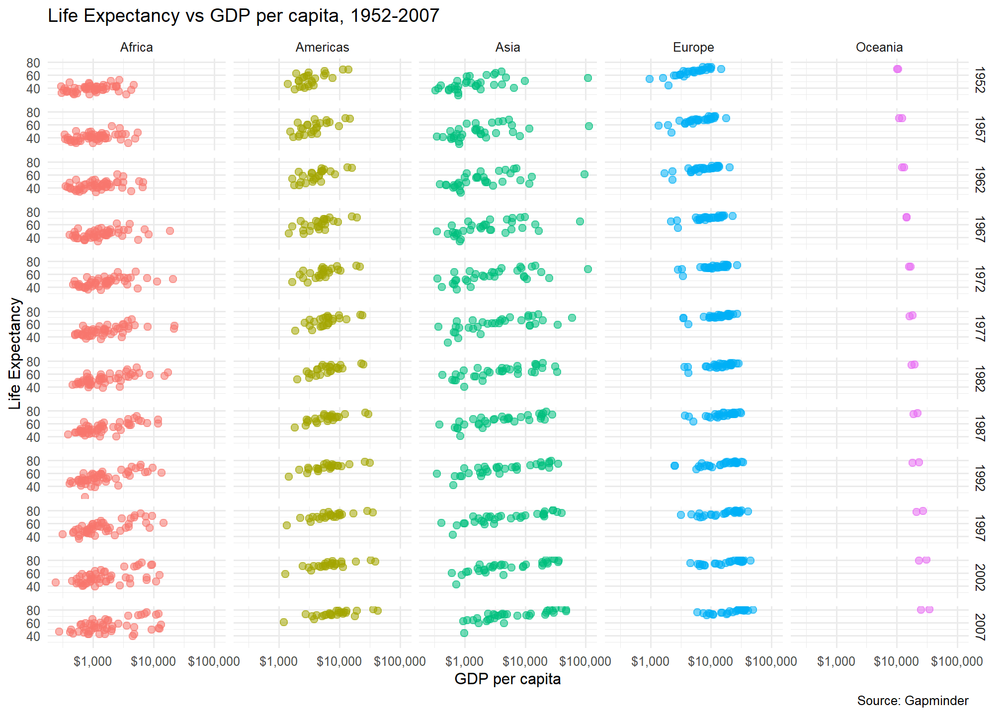 # in our scatterplot, we add a facet_grid() layer where columns = continents and rows = year