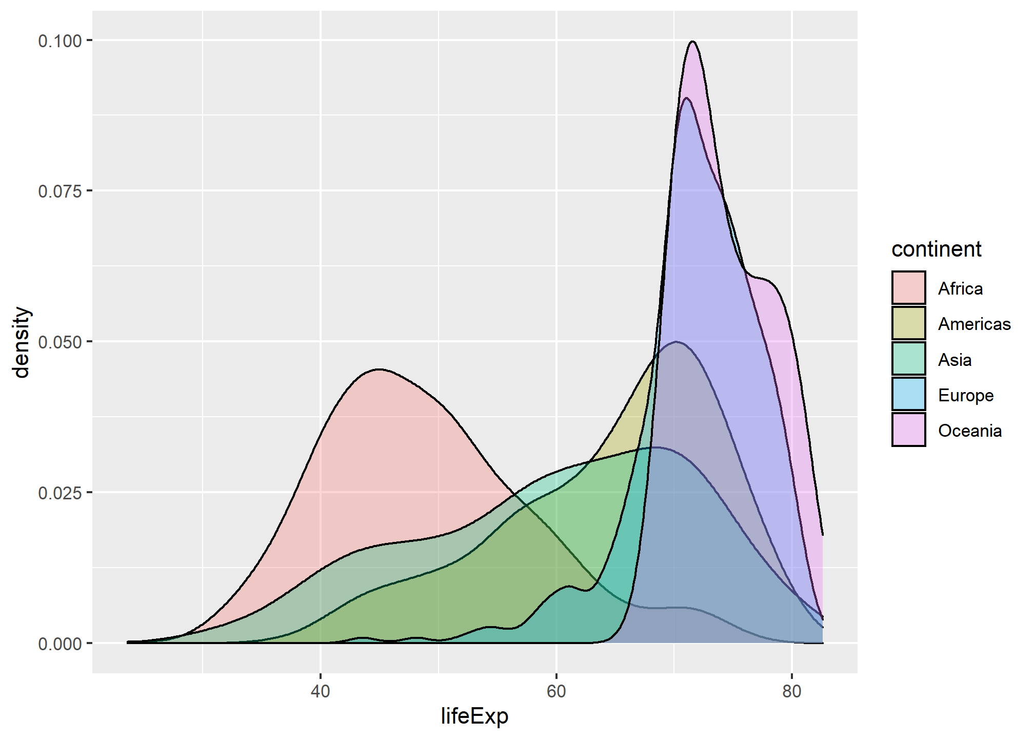 Is this a useful graph? position_stack, the deafult for geom_histogram(), stacks bars on top of each other. Look at the bar that appears right after the 70 year life expectancy. Right at the bottomw, we have a a few observations from, followed by the blue European one, the green Asia, etc. all the way to the top where you see the few red observations that correspond to Africa.
