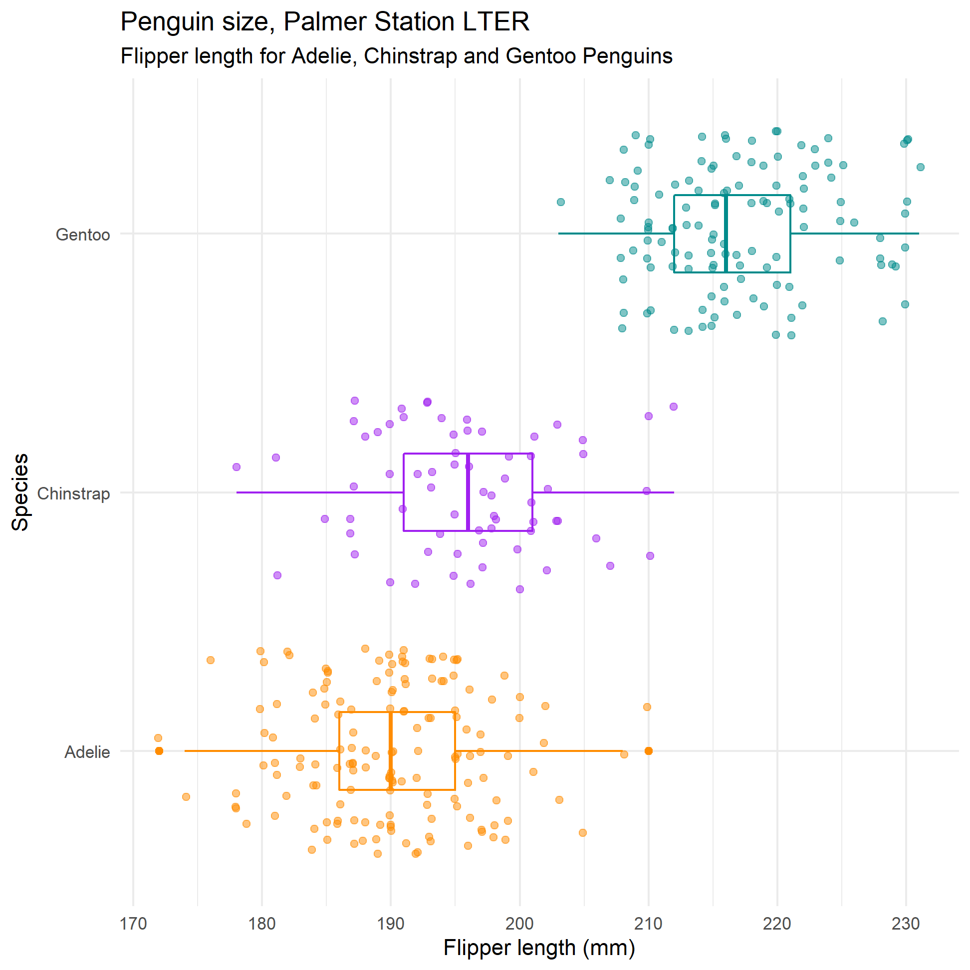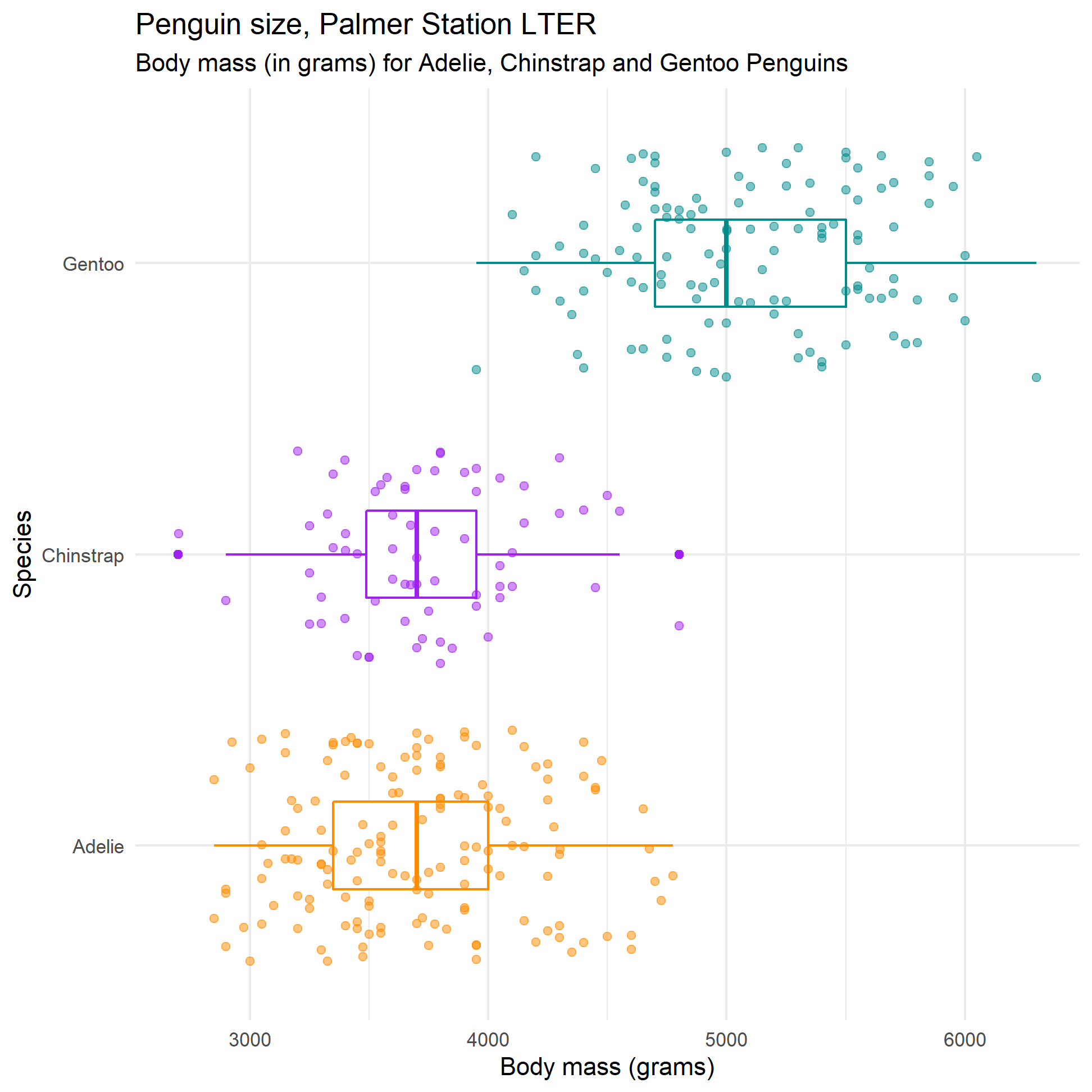 geom_jitter(aes(color = species), alpha = 0.5, show.legend = FALSE, position = position_jitter(width = 0.2, seed = 0)) +