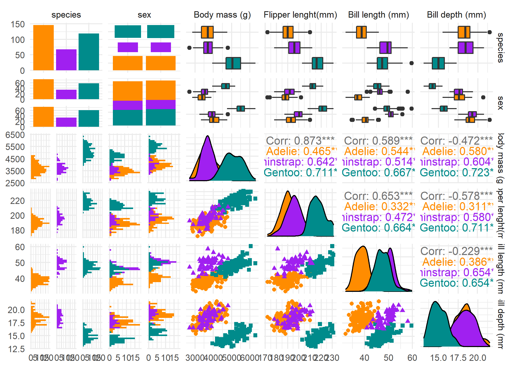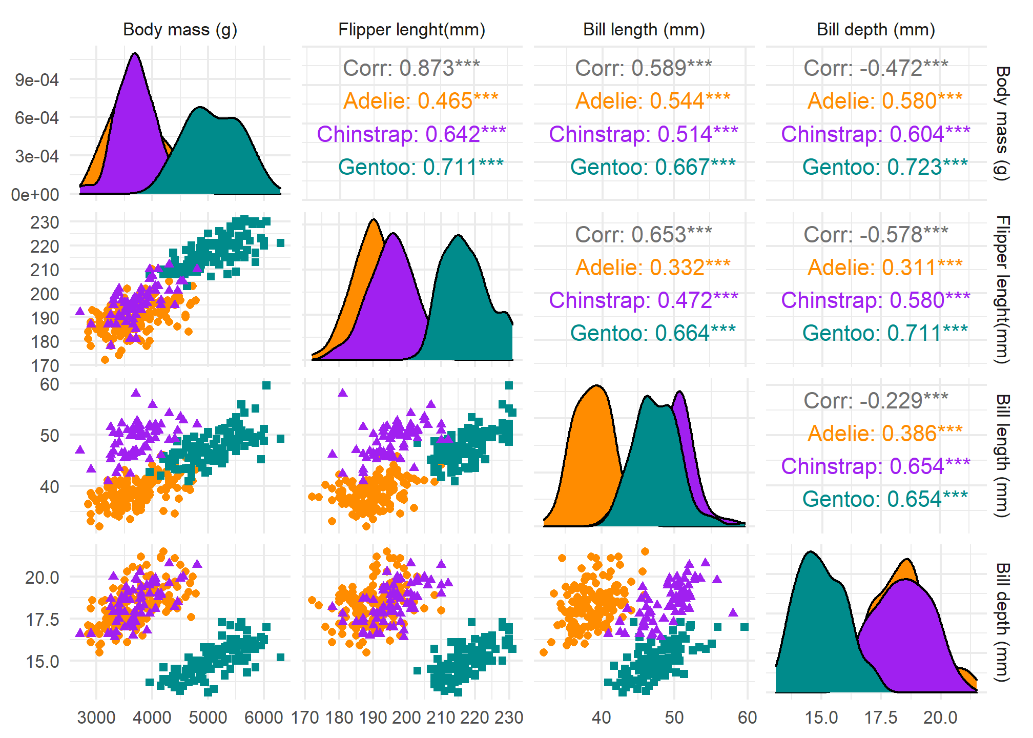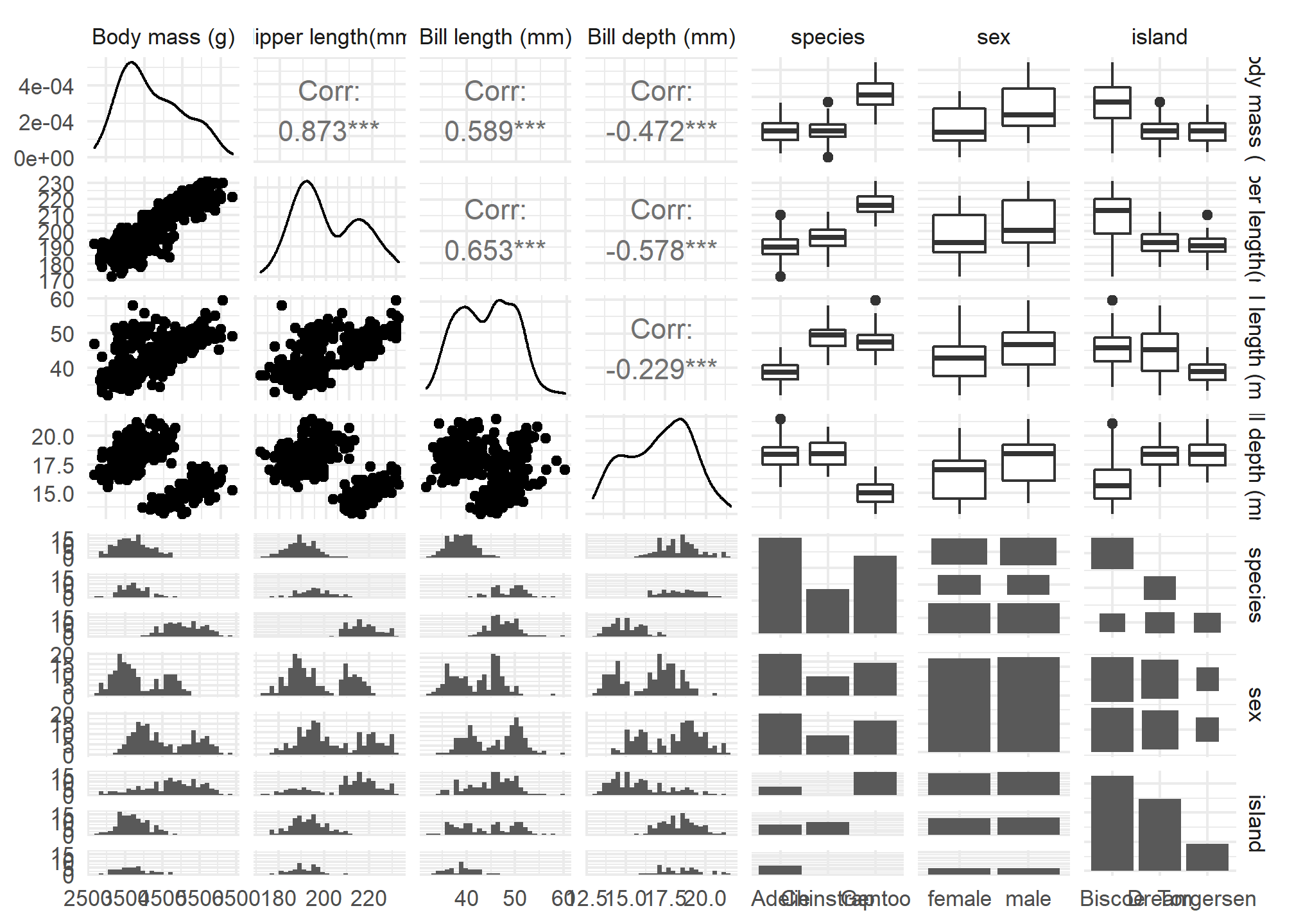 - Along the diagonal we get a density plot of each variable of interest. For instance, body mass seems to be right skewed, and the rest of the variables seem bimodal.