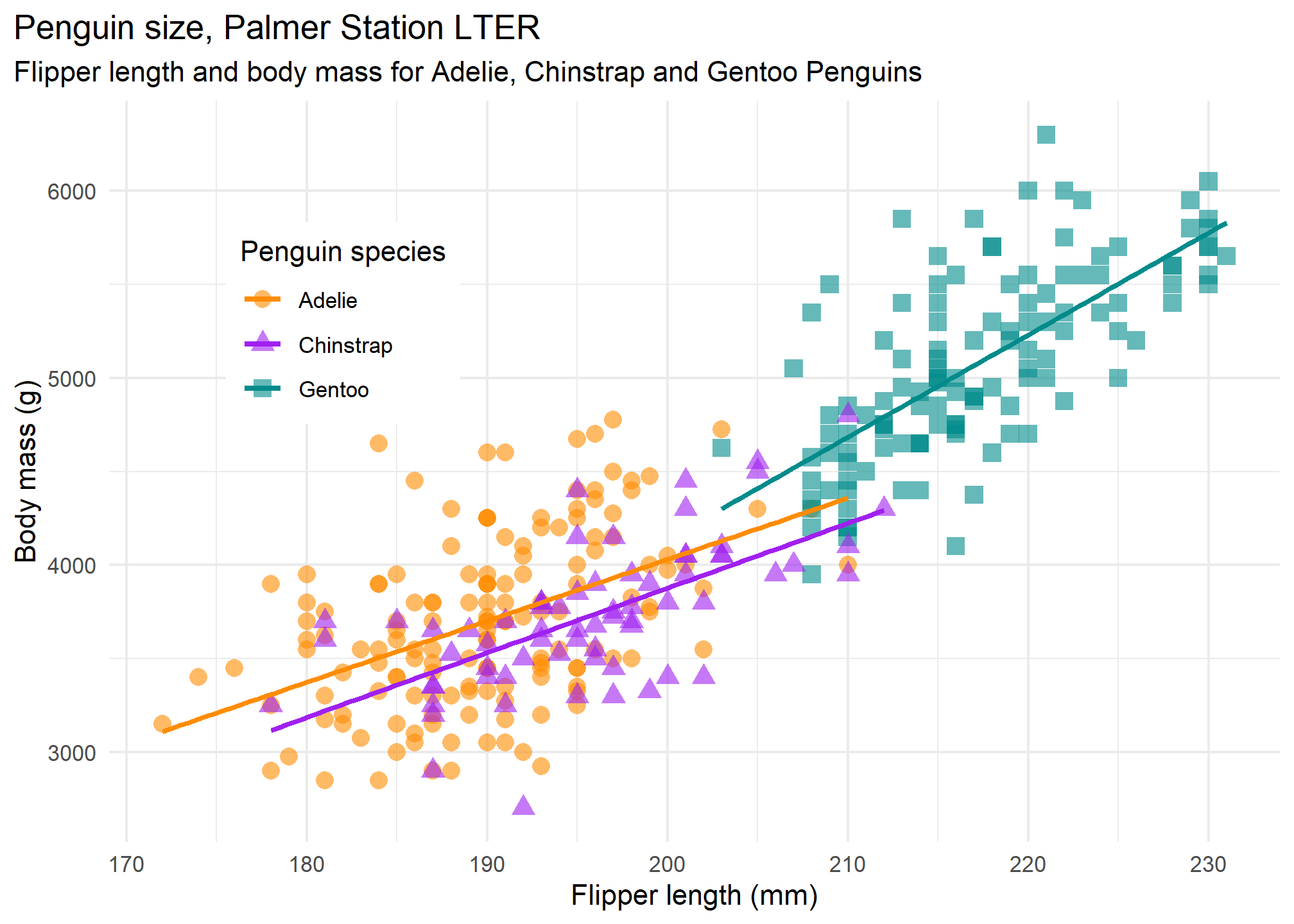 geom_smooth(method = "lm", se = FALSE, aes(colour = species)) +
