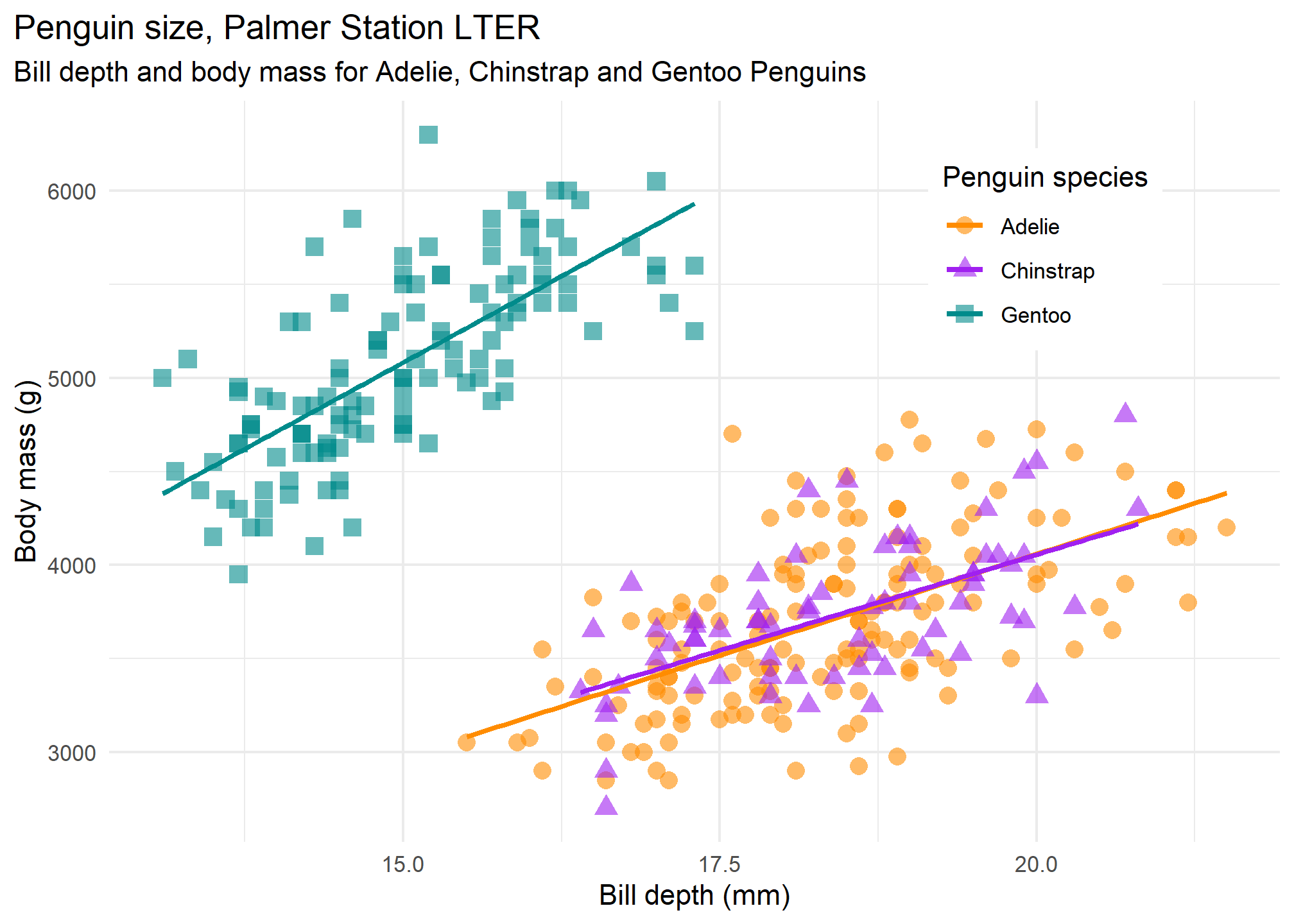 This shows that there is very little difference between Adelie and Chinstrap, but Gentoo is markedly different. All three species have a positive relationship (as bill depth increases, so does body mass), which is not what the numerical correlation coefficient of -0.472 ould have us believe.