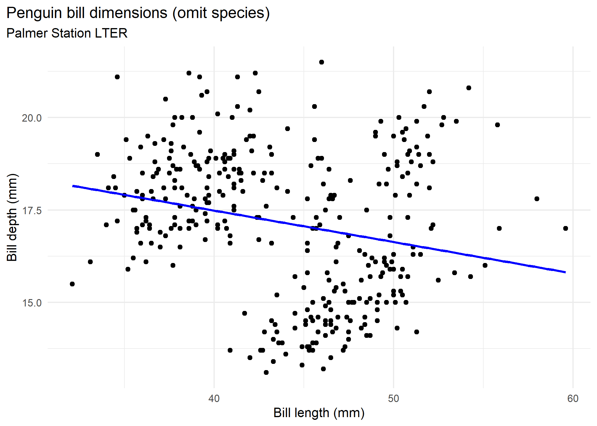 Simpson’s Paradox: Penguin bill length vs bill depth